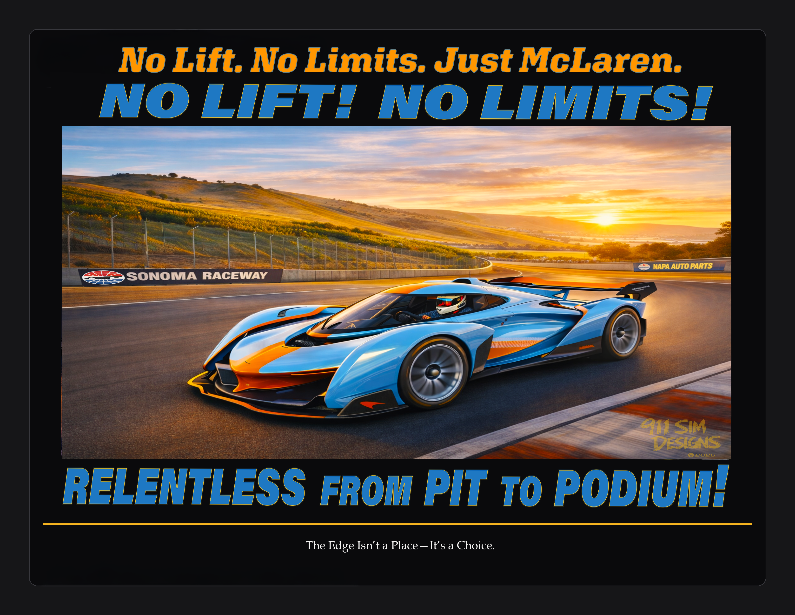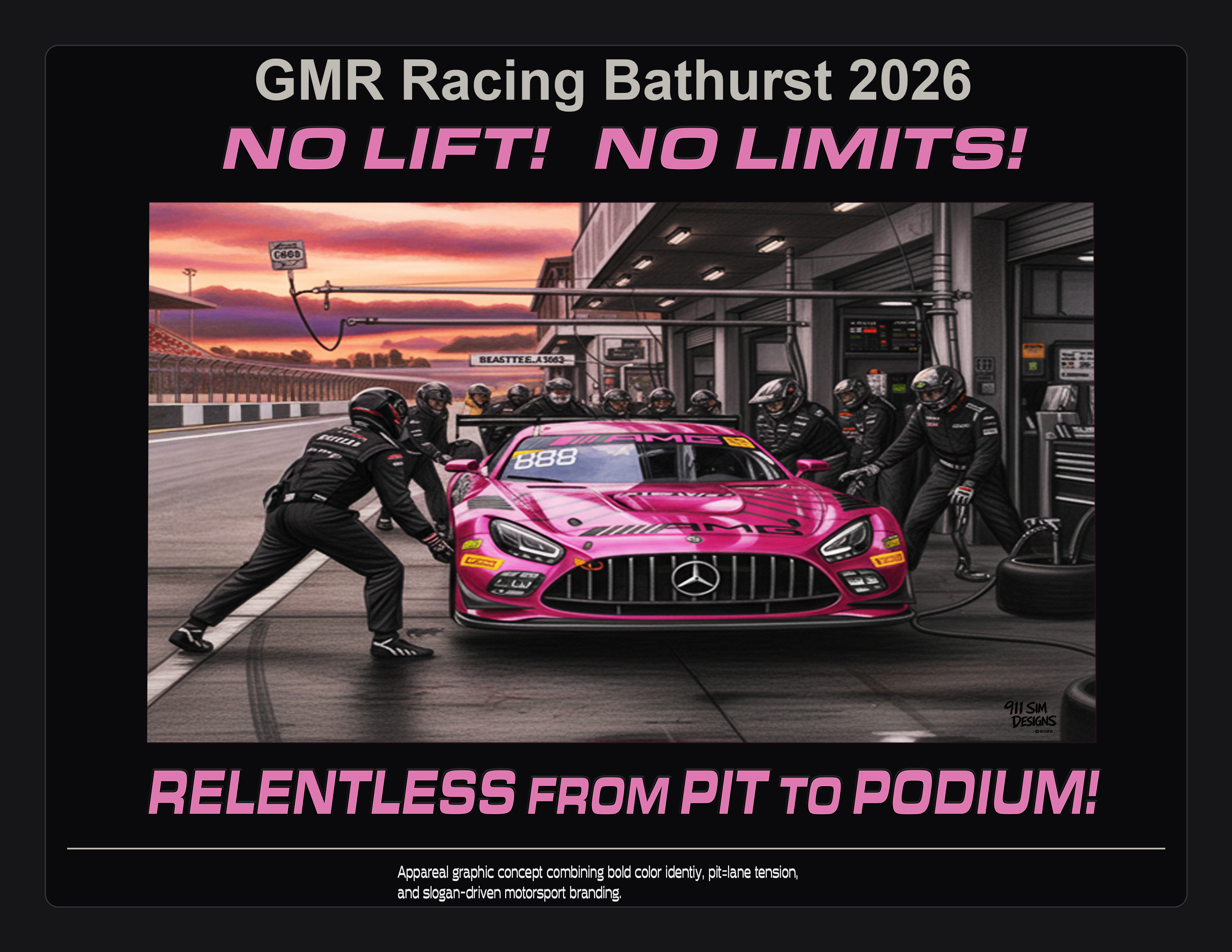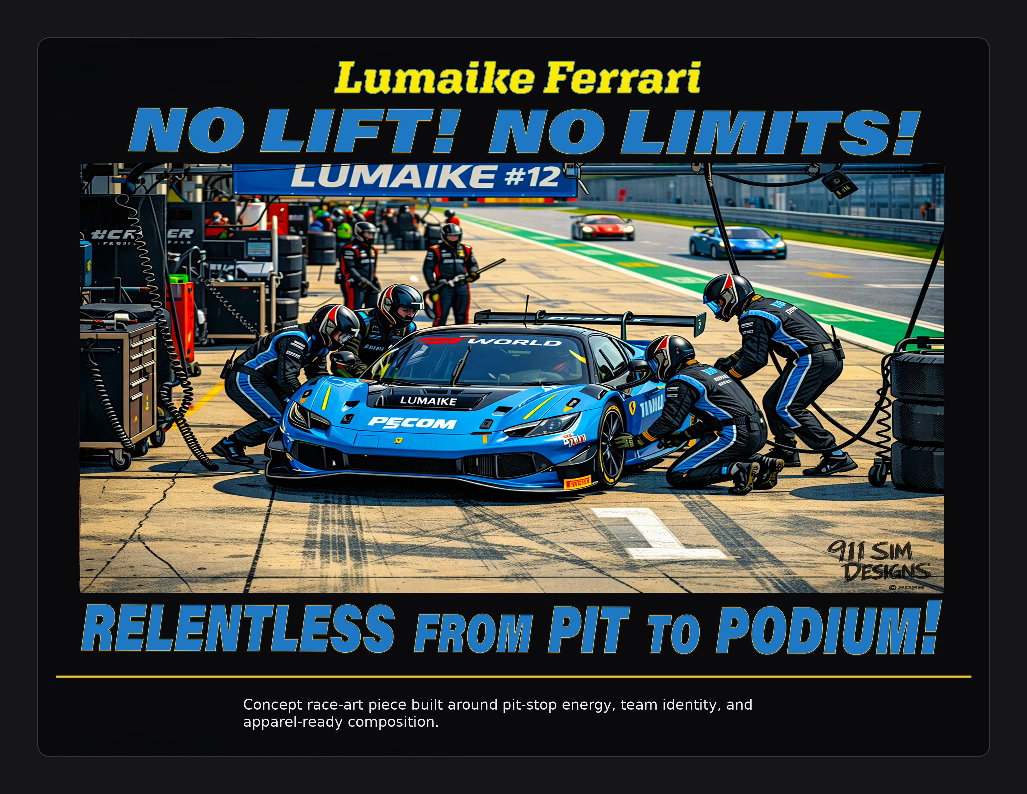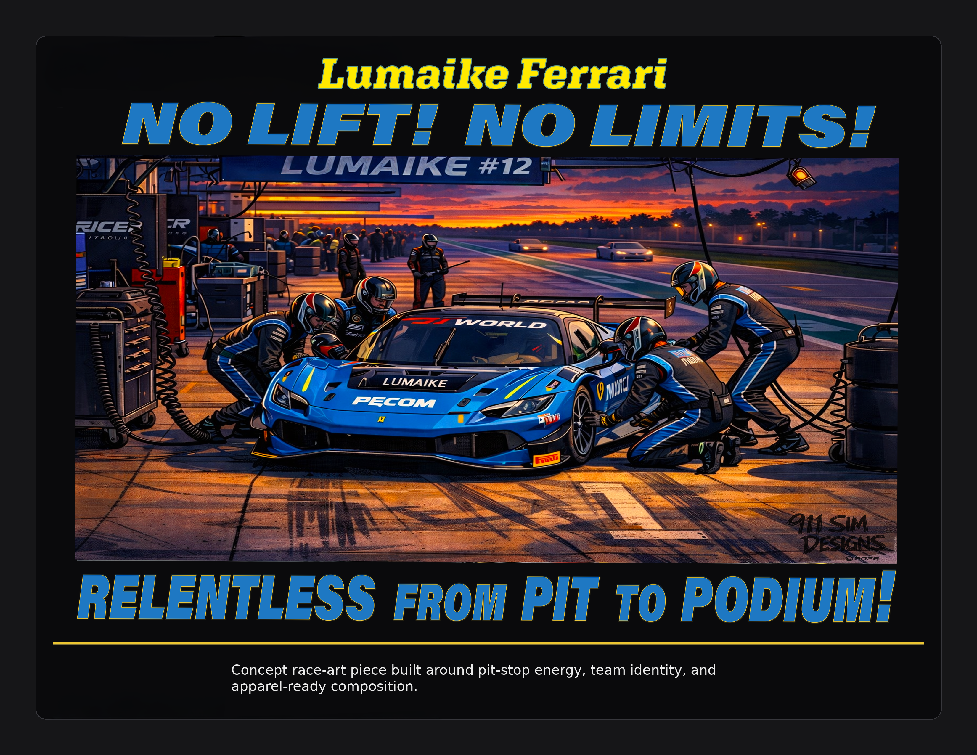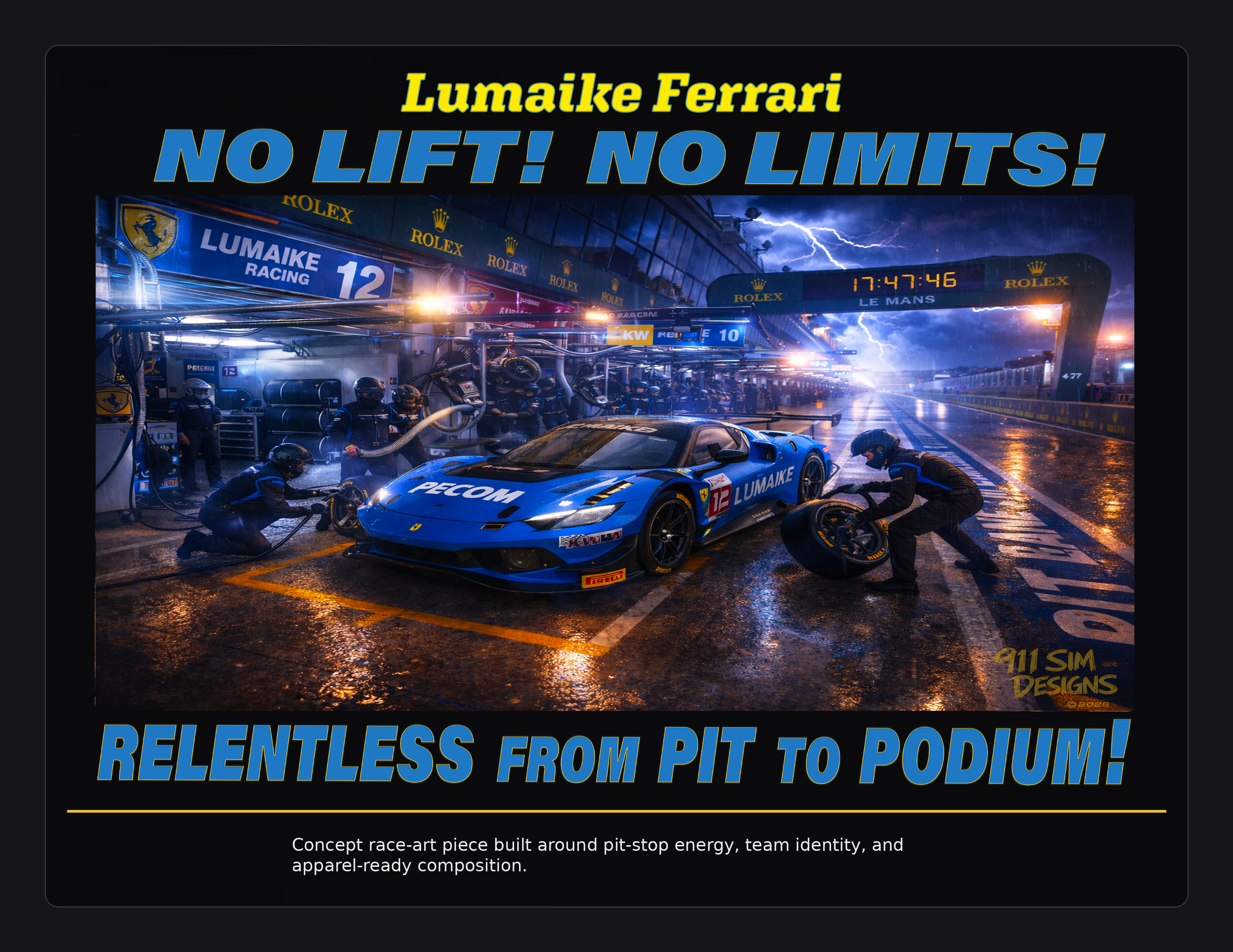 No Lift! No Limits! is the front-facing motorsport brand. 911 Sim Designs is the studio behind the work. The goal is simple: create motorsport visuals that feel bold enough for race teams, clean enough for sponsors, and strong enough for collectors.