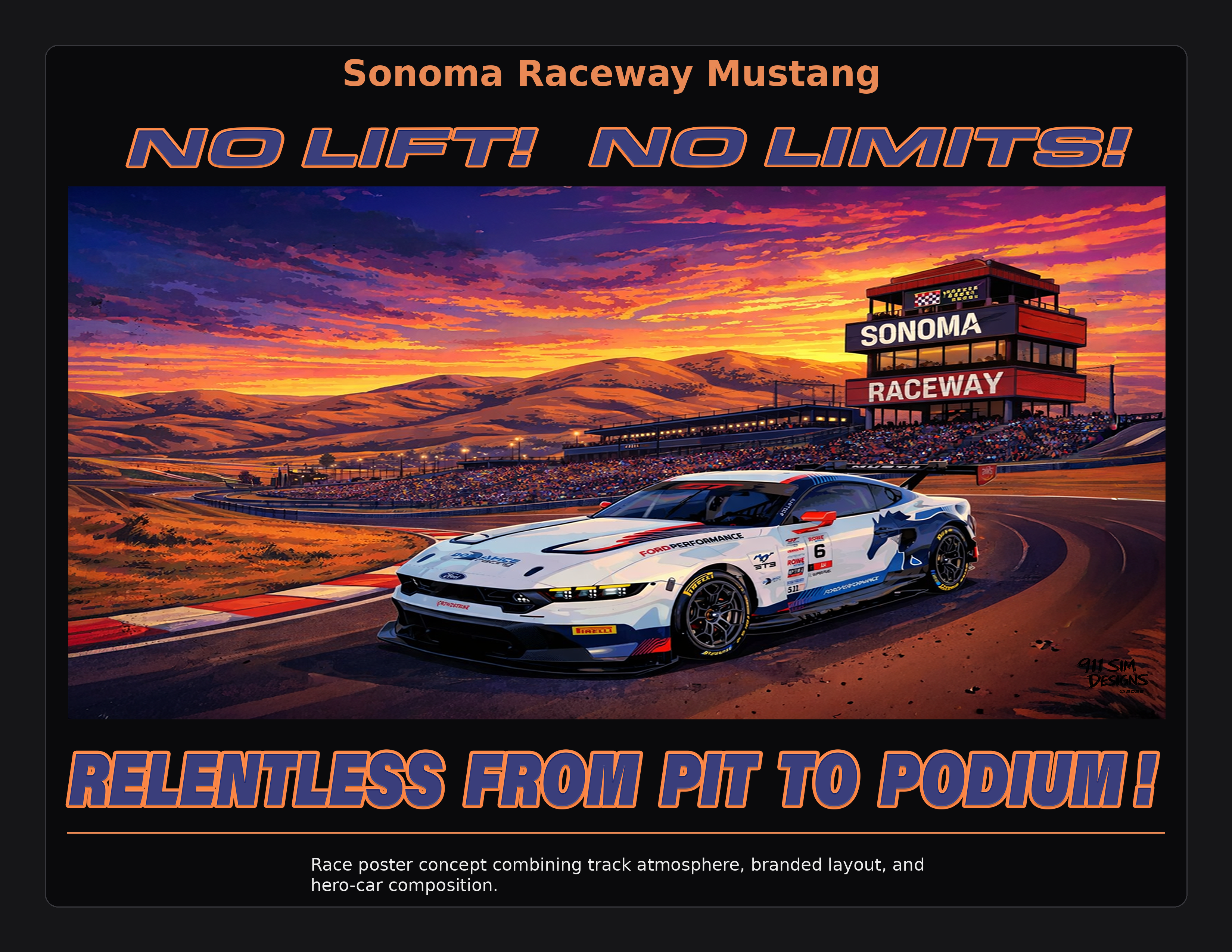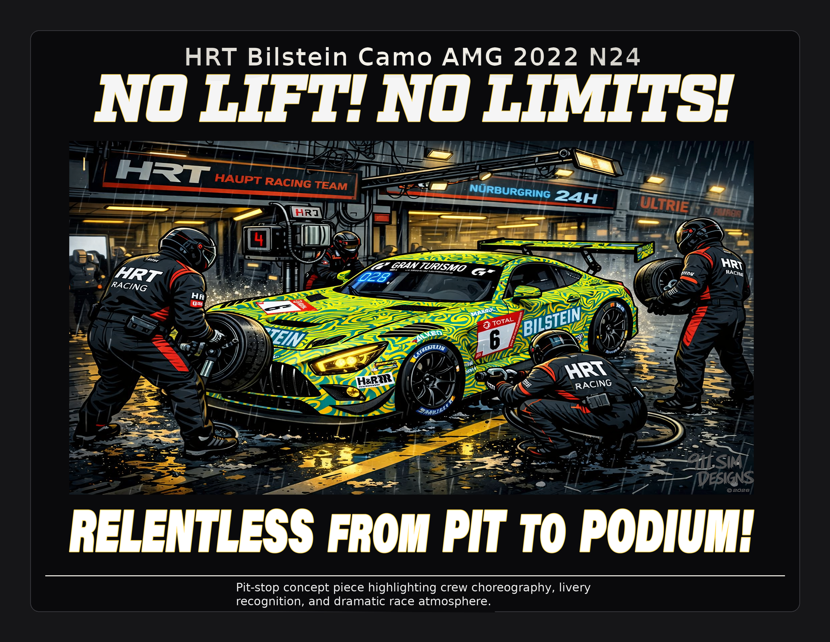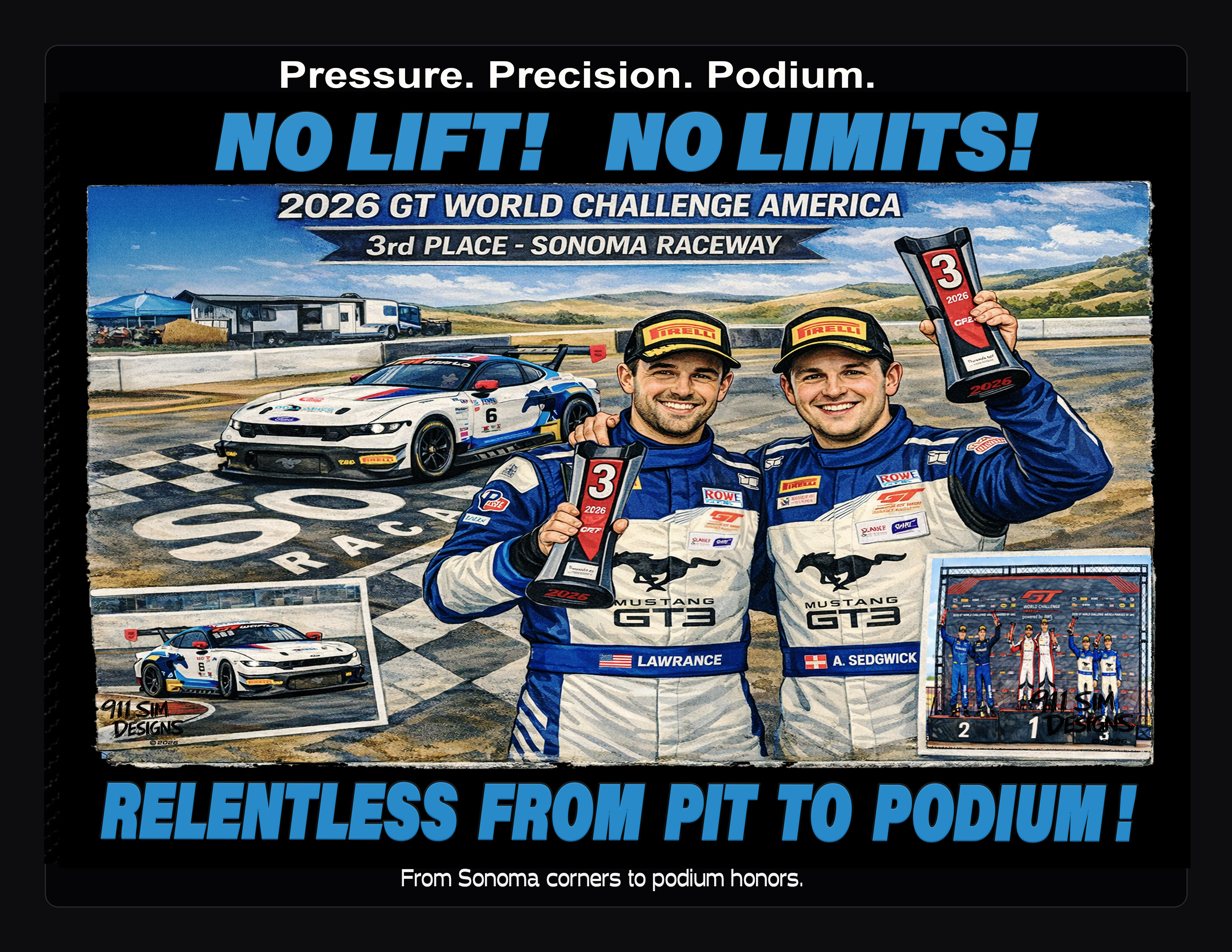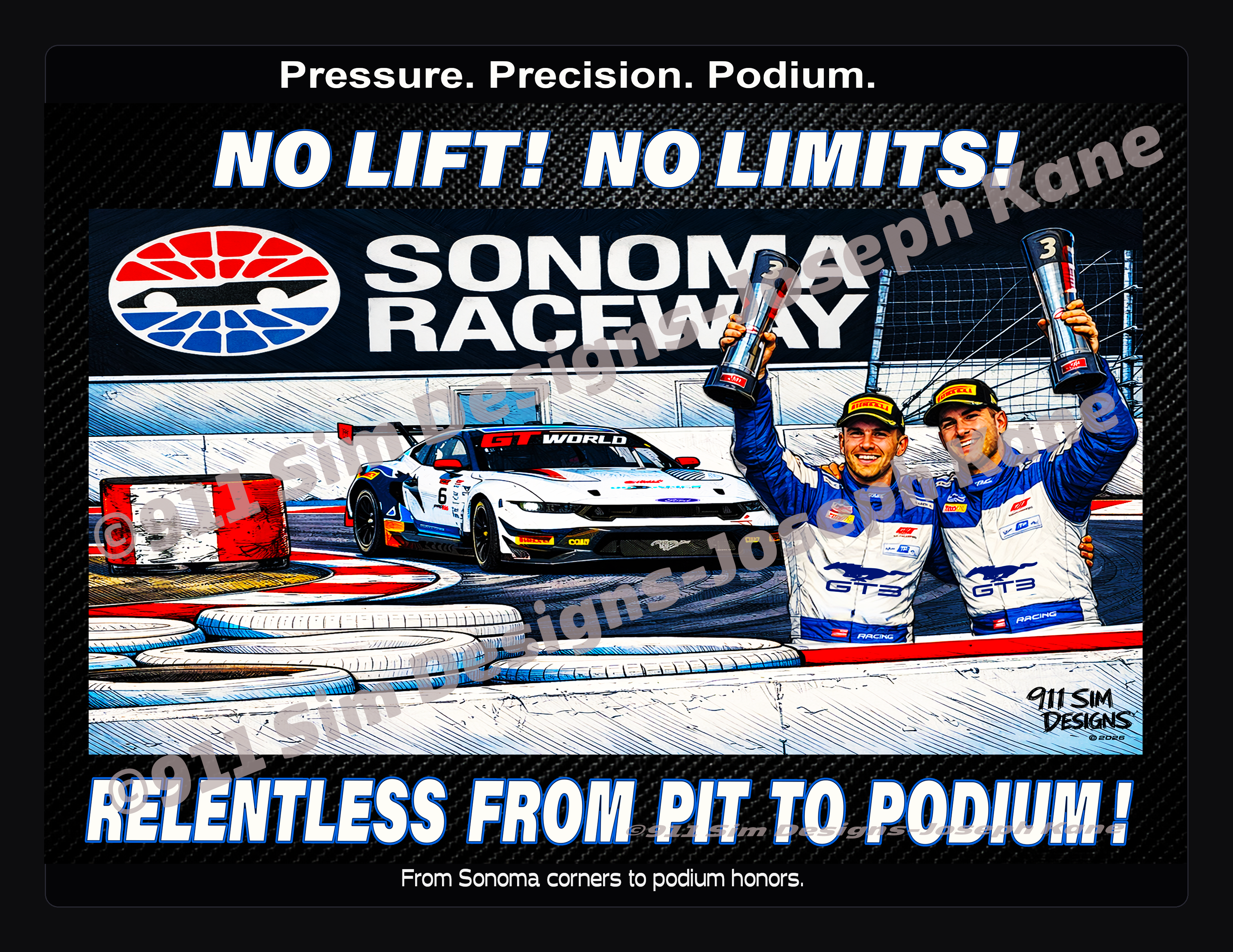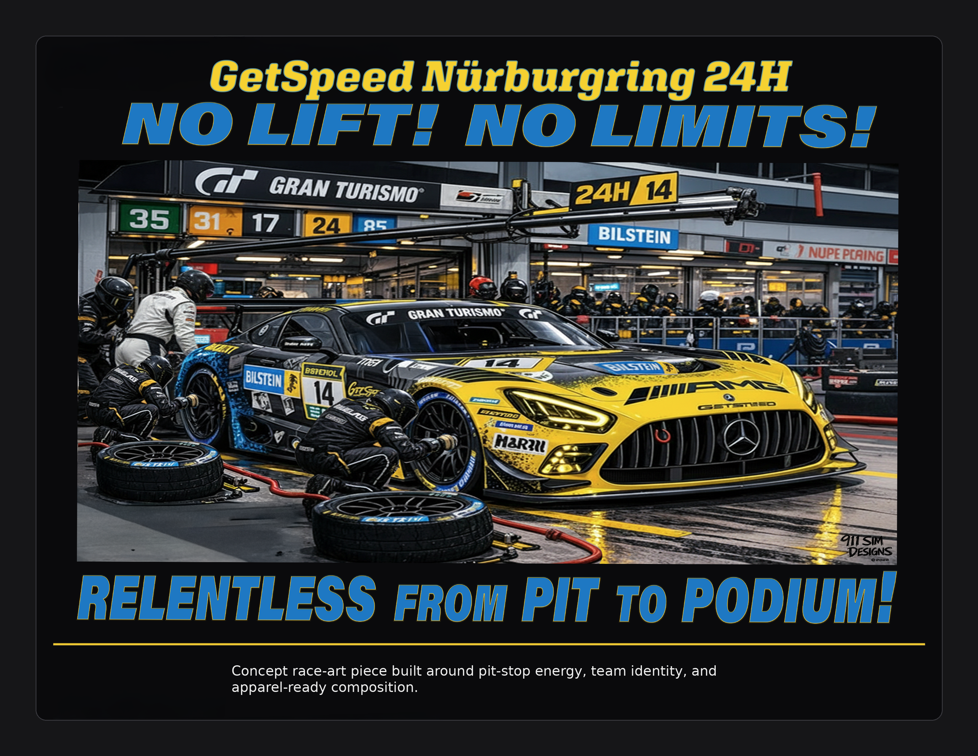 No Lift! No Limits! is the front-facing motorsport brand. 911 Sim Designs is the studio behind the work. The goal is simple: create motorsport visuals that feel bold enough for race teams, clean enough for sponsors, and strong enough for collectors.